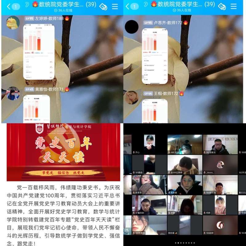 数统院灵活采用互联网、校园网与线下教育相结合,PC端与手机端相结合,现场学习与视频教学相结合等方式,依托“学习强国”、微信公众号、QQ群等新媒体平台,开展形式多样的学习教育,宣传党的奋斗历程、光荣传统和伟大成就。目前,微信公众号已推出25期“百年党史天天读”,累计阅读量达4000余次;全体党员的“学习强国”活跃度连续多日达100%;开展主题班会、团日活动、学习分享会90余场。