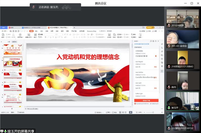 接玉芹作动员讲话,她强调全体入党积极分子要以党史学习教育为总任务,从党史学习中汲取智慧,在党史学习中不断坚定理想信念;要学好党史、学深党史、学透党史,做到学史明理、学史尊信、学史崇德、学史力行,传承好红色基因;要切实学有所思、学有所得、学有所获、学有所成,内化于心、外化于行,为全面建设社会主义现代化国家、实现中华民族伟大复兴中国梦贡献青春力量。随后,接玉芹讲授题为《入党动机与党的理想信念》的专题党课。
