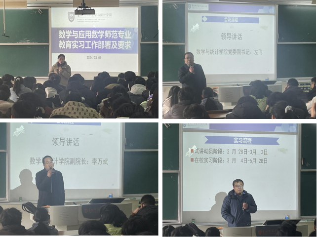 2024年3月1日下午, BETWAY必威在教学主楼B101教室举行了2021级数学师范专业员工教育实习动员会。BETWAY必威党委书记接玉芹,副书记左飞,副经理李万斌,数学系主任任颜波,副主任徐海龙等老师以及2021级数学师范专业全体同学参加会议,任颜波主持会议。