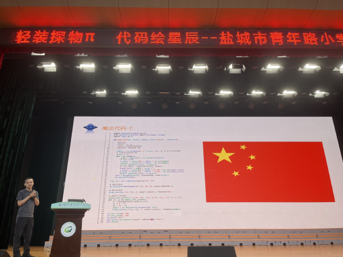 公司信息与计算科学系主任孟凡淇化身为“数字世界的魔法师”,给在场的小员工表演了数学魔术。“同学们看,这些数字正在变成闪耀的星星!”随着他的演示,一行行抽象的数字代码在屏幕上奇迹般地“变身”。眨眼间,飘扬的五星红旗迎风招展,人造卫星冲破云霄、翱翔天际。孟凡淇主任用生动有趣、通俗易懂的语言,将复杂晦涩的编程原理拆解成一个个趣味实验,带领孩子们在代码的奇妙世界里探索遨游,现场不时响起阵阵惊叹与热烈掌声。