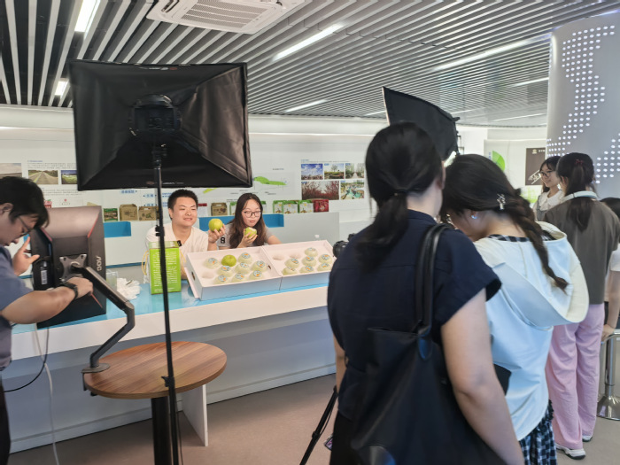 在桃花源林果交易中心,志愿者正有序开展直播助农活动。庞波董事长与同学们深入交流,详细询问直播进展、遇到的困难及实践收获,对大家运用专业知识助力农产品销售的成效给予肯定,勉励同学们继续探索创新助农路径。
