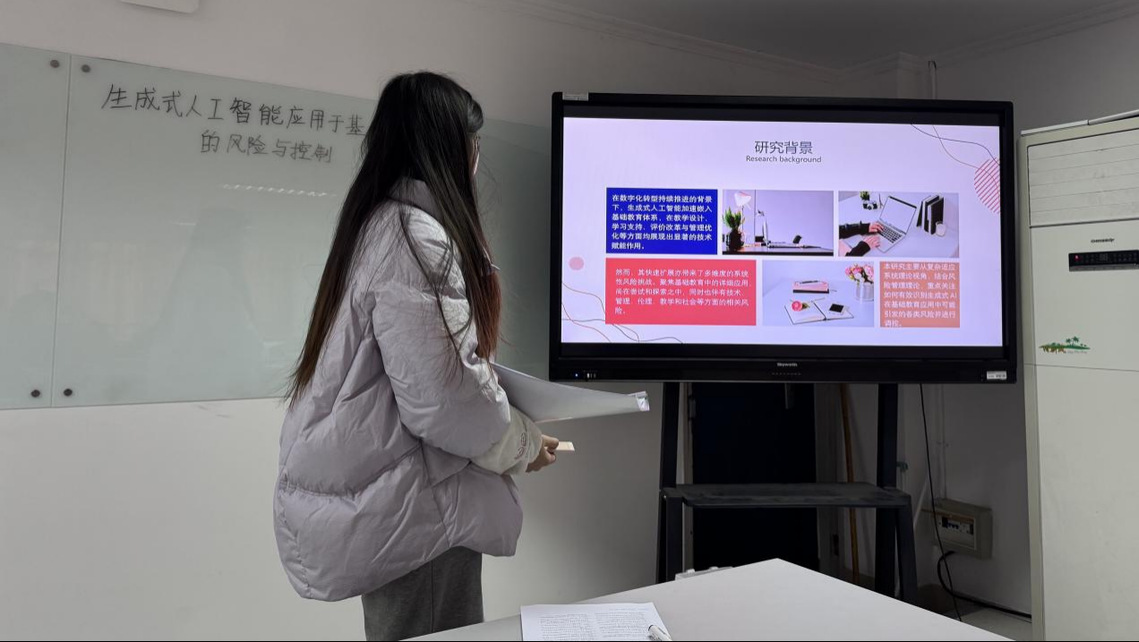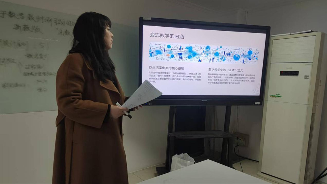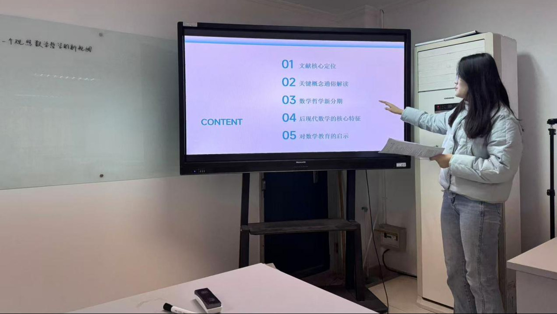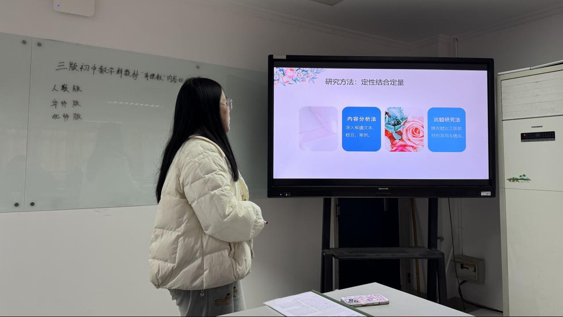 汇报中,王静杰结合文献指出,批判性思维是突破认知局限的关键动力,并以“建模不能只建不评”为例,提供哲学层面的理论依据。吴佳佳比较了人教版、华师版和北师大版七年级“有理数”教材在内容编排、概念呈现、数学文化及例习题设计等方面的异同,探讨从“教教材”到“用教材教”的课堂优化。仲瑶瑶从原则、方法与编排方式三方面,归纳数学例习题变式教学的本质与目标。周嘉怡基于复杂适应系统理论,分析生成式AI在基础教育中的多维风险,并探讨系统性成因与宏观治理路径。