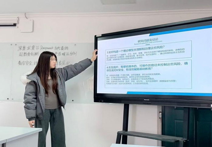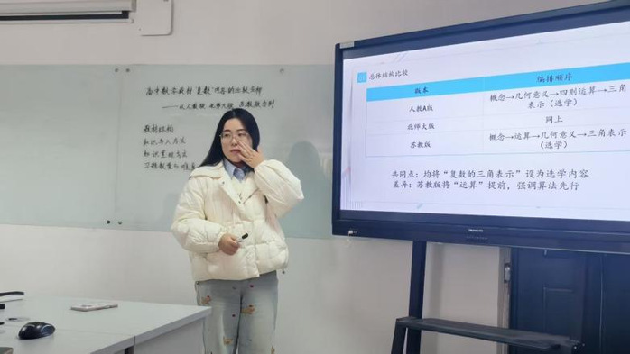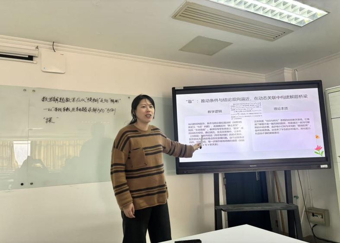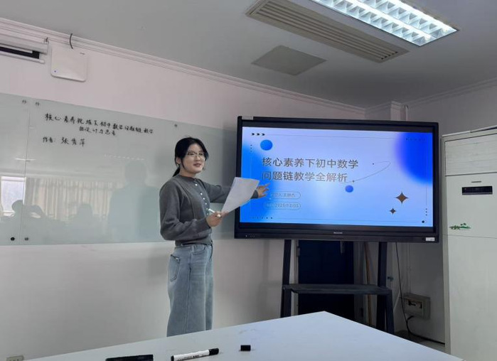 在汇报环节中,王静杰从核心素养角度探讨了初中数学问题链教学,认为通过逻辑清晰的问题序列能够引导员工主动探究知识、促进思维发展,有效落实核心素养。吴佳佳对人教A版、北师大版及苏教版教材中“复数”内容进行了比较分析,注意到各版本均缺少真实情境题目,并建议教师可整合教学资源,融入跨学科应用习题,从而加强员工的数学建模与实际问题解决能力。仲瑶瑶围绕导数解题教学,探讨了当前教学中存在的“模糊化”现象,并介绍了“探、靠、换”三种精确化指导策略,强调应帮助员工建立可操作的思维路径。周嘉怡结合国家推动教育智能化的政策背景,提出新一代人工智能技术有望成为突破传统教学瓶颈的重要助力。