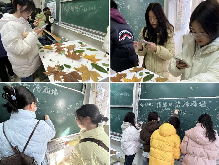 三项创意互动环节为参与活动的同学搭建情绪出口与情感桥梁。“盲盒解忧”环节中,参与者在“情绪书写”区写下烦恼并拍照留存,随即抽取他人手写的祝福或简笔画盲盒回信,感受来自他人的善意;“叶笺心声”以自然为媒,同学们将心底感言写于银杏、香樟等落叶背面,搭配枯枝、彩纸拼贴创作,阳光穿透时叶脉文字若隐若现,勾勒独特心灵图景;“定格青春”环节里,用浅蓝、明黄、浅紫、暖橙四色形成涂鸦墙,同学们用粉笔在涂鸦墙上留下“心情印记”,定格青春群像。活动贴近员工群体,富有创意,鼓励同学放下负担和烦恼,收获共鸣和温暖。