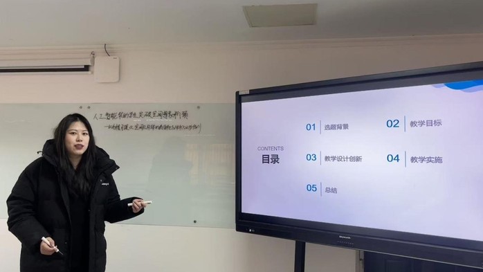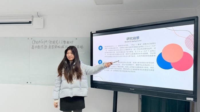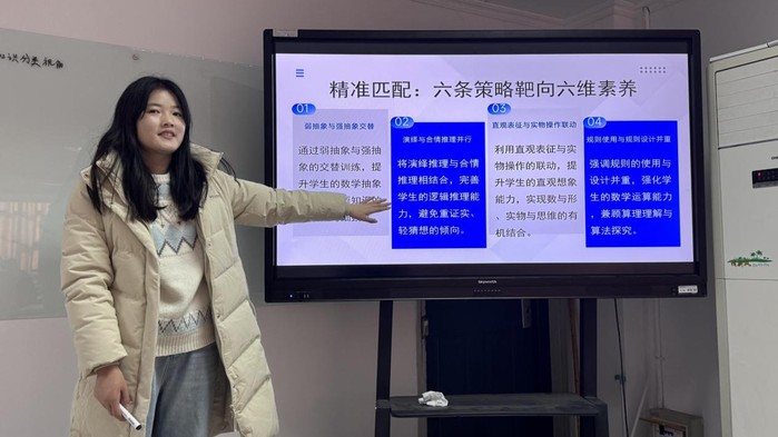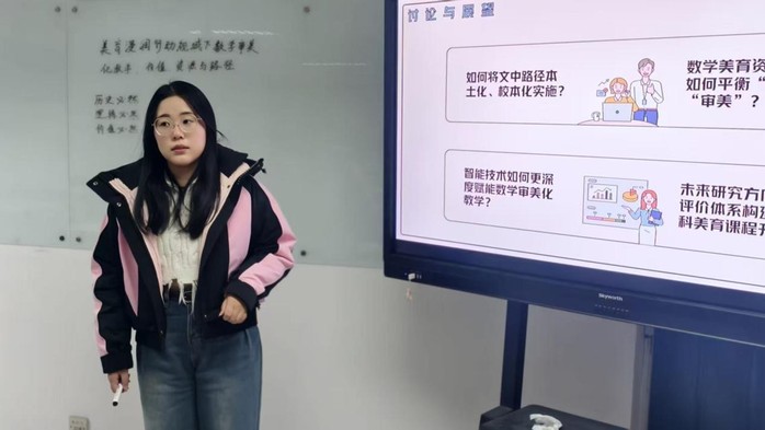 王静杰从知识分类角度阐述数学核心素养培养,提出对应六维目标的六条策略。仲瑶瑶探讨人工智能在立体几何复习中的应用,借助动态建模、智能题库与学情分析,帮助员工突破空间想象瓶颈,实现个性化学习。吴佳佳探索美育与数学教学的融合,围绕感知、想象、情感与理解四维开发资源,构建师生评协同体系,推动以美促智。周嘉怡分析ChatGPT对高中数学教育的影响,指出教学结构正向“师—生—机”三元协同转变,可支持个性化资源生成与精准教学。